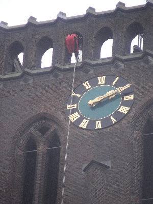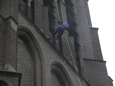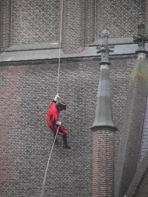 Hij klimt met een touw naar beneden waar nog meer pieten staan te wachten. |