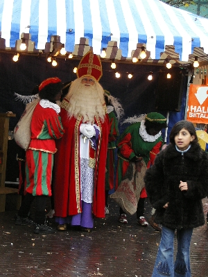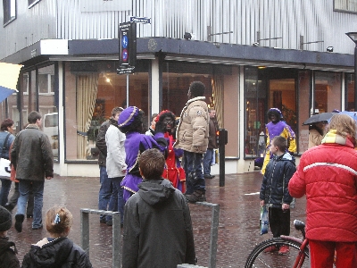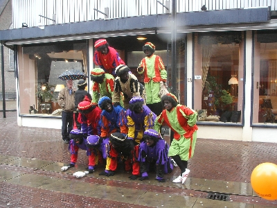 | Daar zijn allemaal pieten die druk bezig zijn met kunsten te vertonen. Volgens mijn staat daar een jongetje te kijken die later ook piet wil worden. |